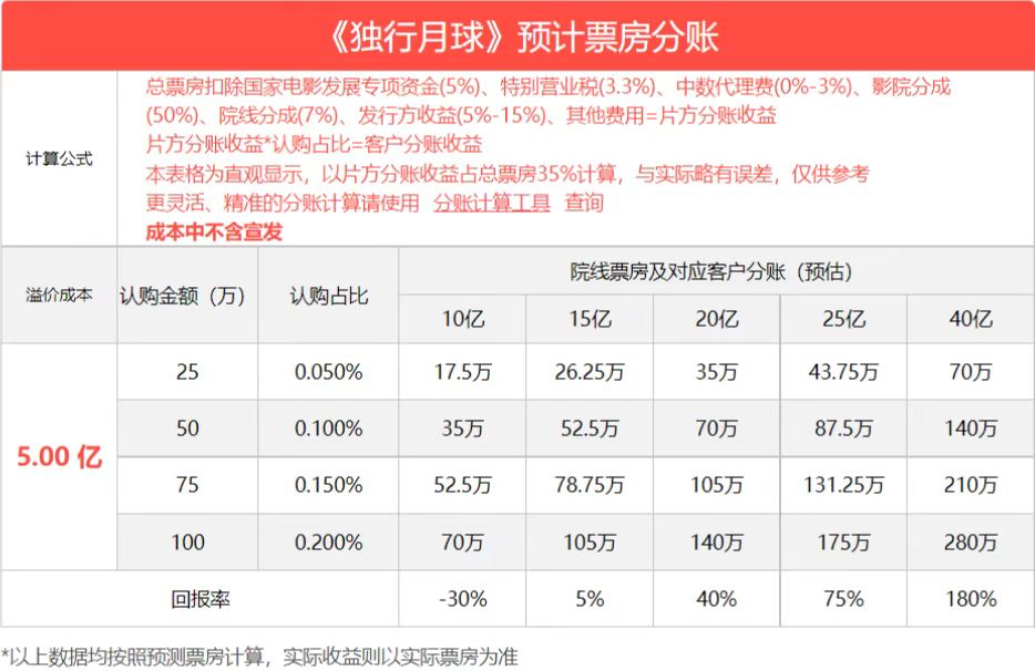 保底票房15亿,还有少量投资份额,与联合出品方签协议,保证权益,投资收益周期24个月,每6个月分一次账,第一次在院线下映后3-6个月分账24个月分账,以后每次结算之前票房收益。