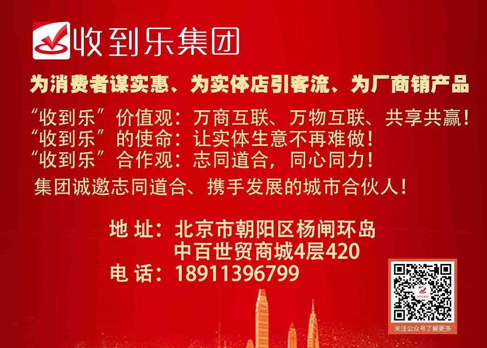 我们“收到乐(北京)网络科技集团有限公司”创建的“收到乐”新消费生态平台(网址:www.shoudaole.cn,“收到乐”微信公众号、“收到乐”APP一并运行。安卓版APP下载见二维码,苹果版APP下载搜索“收到乐平台”),是一个长期为实体商家引流复购和提供“保姆式”服务为经营核心的服务型平台。同时,也为各厂家的产品直销全国助力!